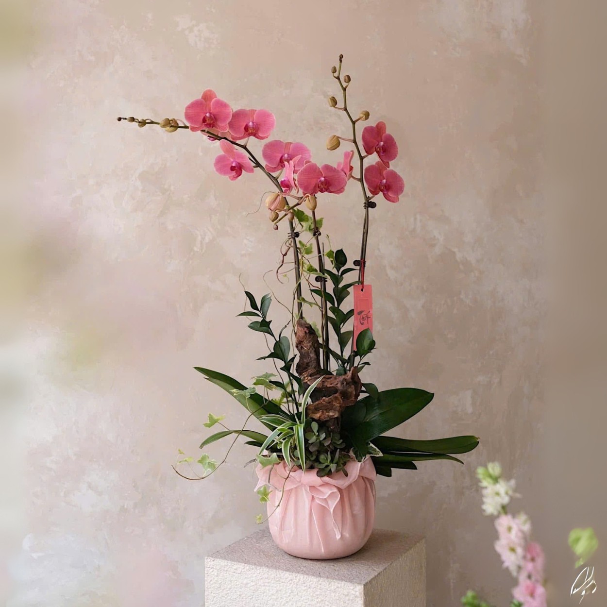 Chậu lan này được tạo nên từ lan, lá phụ, bách hợp sọc cùng gỗ lũa làm nền. Sự kết hợp hài hòa này tạo ra nét đẹp tự nhiên, vừa thanh lịch vừa sang trọng. Đặc biệt, sự xuất hiện của tiểu hồ điệp càng tôn thêm vẻ mềm mại, duyên dáng cho tổng thể chậu hoa. Đây chính là sự hòa quyện đầy nghệ thuật giữa màu sắc và ý nghĩa.