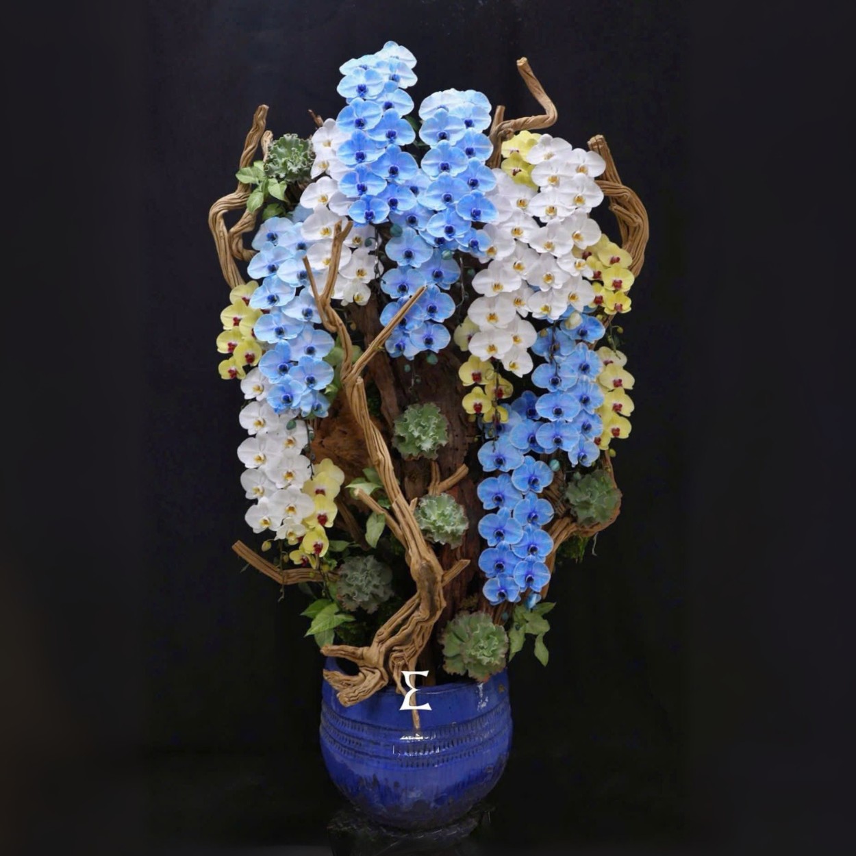 Thiết kế của chậu hoa chú trọng sự cân đối và hài hòa trong từng chi tiết. Sự kết hợp của lan hồ điệp xanh dương với các loài hoa khác tạo nên vẻ đẹp tinh tế và nổi bật. Bó hoa không chỉ làm đẹp không gian mà còn lan tỏa năng lượng tích cực, đem lại niềm vui cho người nhận.