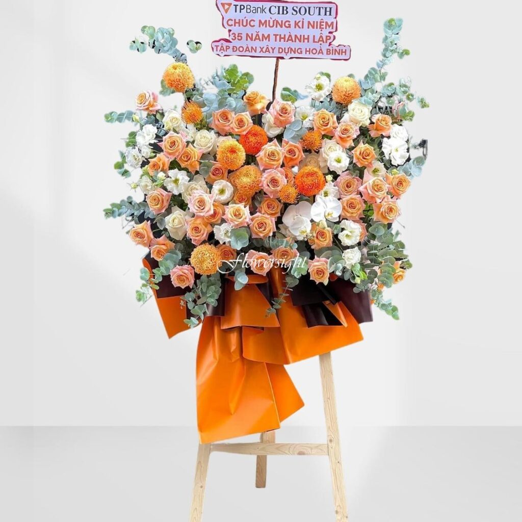 Khởi đầu vinh quang và thành công rực rỡ với kệ hoa “Rạng Danh” – cho sự phát triển mạnh mẽ. Vẻ đẹp nổi bật của kệ hoa mang đến lời chúc tươi sáng, thúc đẩy doanh nghiệp đạt được những thành tựu mới.