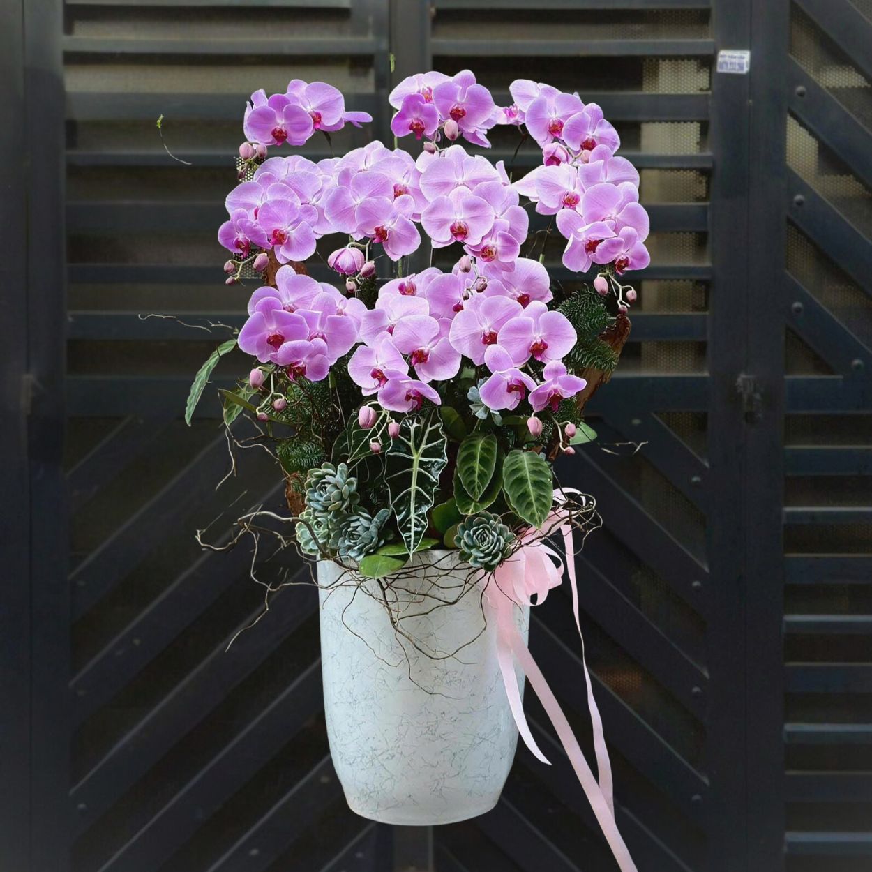 Chậu hoa Rạng ngời sự nghiệp sở hữu bố cục trang nhã, nổi bật với sắc lan hồ điệp màu hồng – biểu tượng của sự dịu dàng, tinh tế nhưng cũng đầy kiên định. Màu hồng không chỉ tạo cảm giác dễ chịu mà còn rất hợp với không gian văn phòng, góc học tập hoặc trang trí tại nhà.
