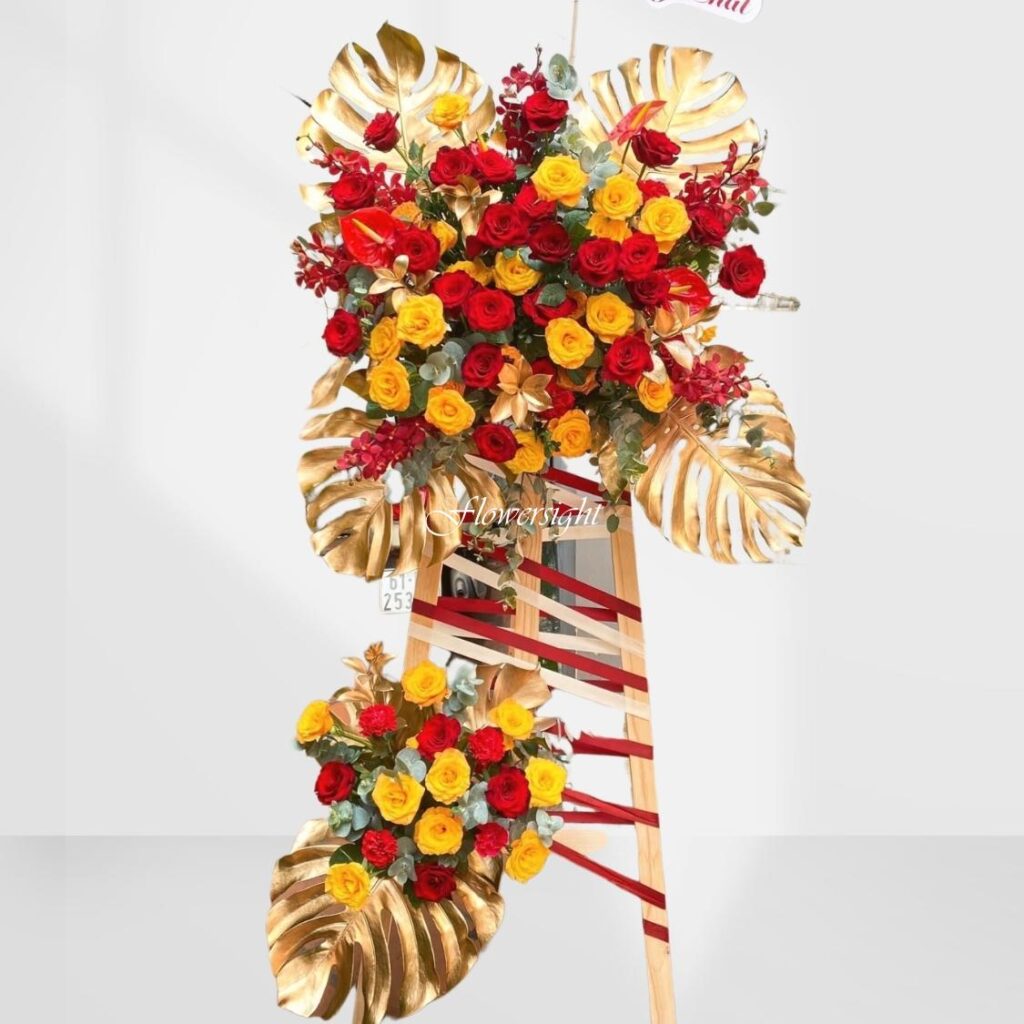Kệ hoa “Sắc Màu” – nổi bật với thiết kế 2 tầng rực rỡ, gửi gắm lời chúc khai trương may mắn và phát đạt. Sự kết hợp đa sắc hoa mang đến năng lượng tích cực, mở đầu hưng thịnh cho hành trình mới.