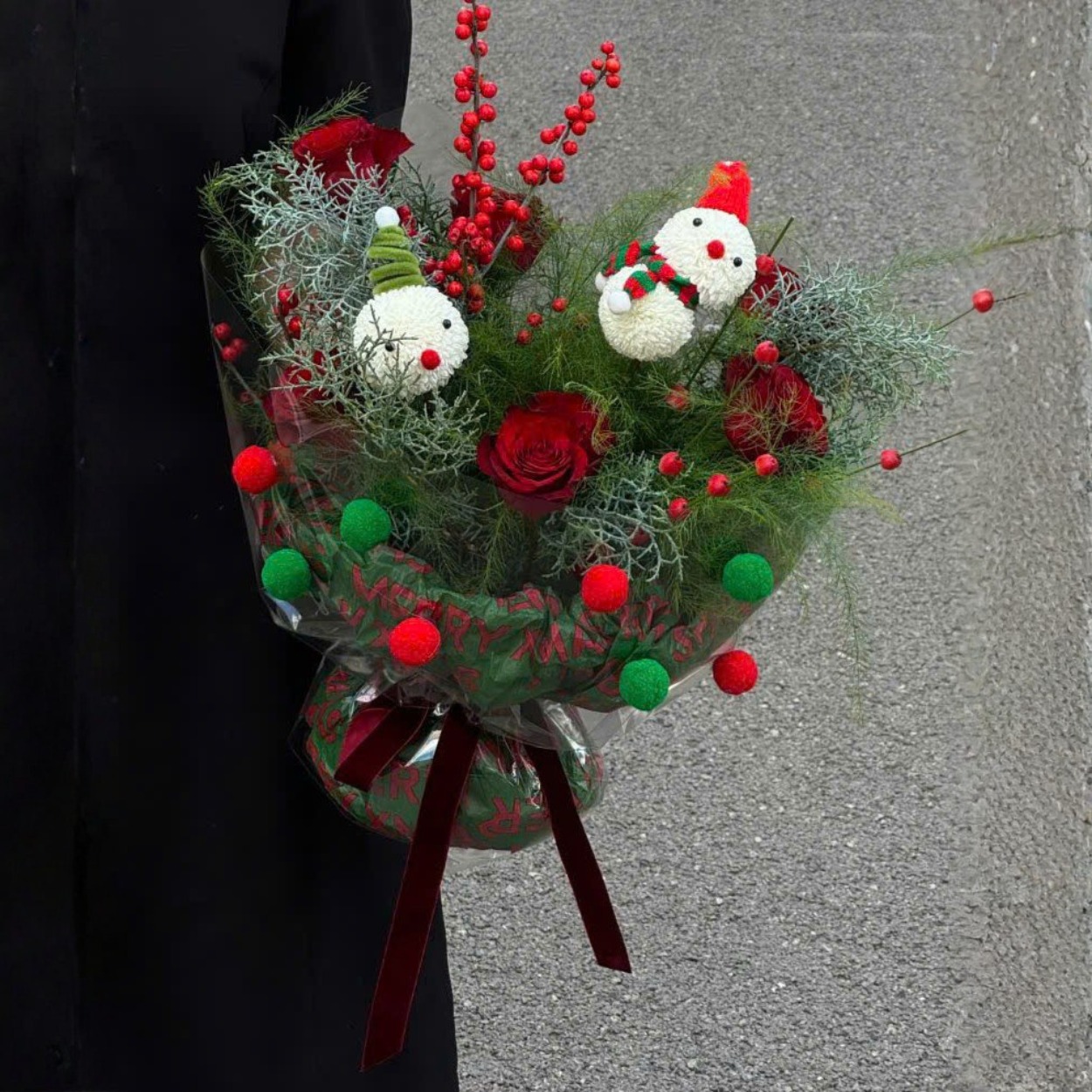 Bó hoa tái hiện một cảnh Giáng Sinh thu nhỏ – nổi bật với sắc đỏ ấm áp, kết cấu lá tùng mềm nhưng vững, điểm xuyết chuỗi ngọc đỏ và đào đông sáng rực, tựa như ánh đèn nhỏ giữa buổi tối mùa đông. Trung tâm bố cục là hai tạo hình người tuyết ping pong đáng yêu, mang lại nét vui tươi nhưng vẫn giữ trọn sự tinh tế của một thiết kế nghệ thuật.