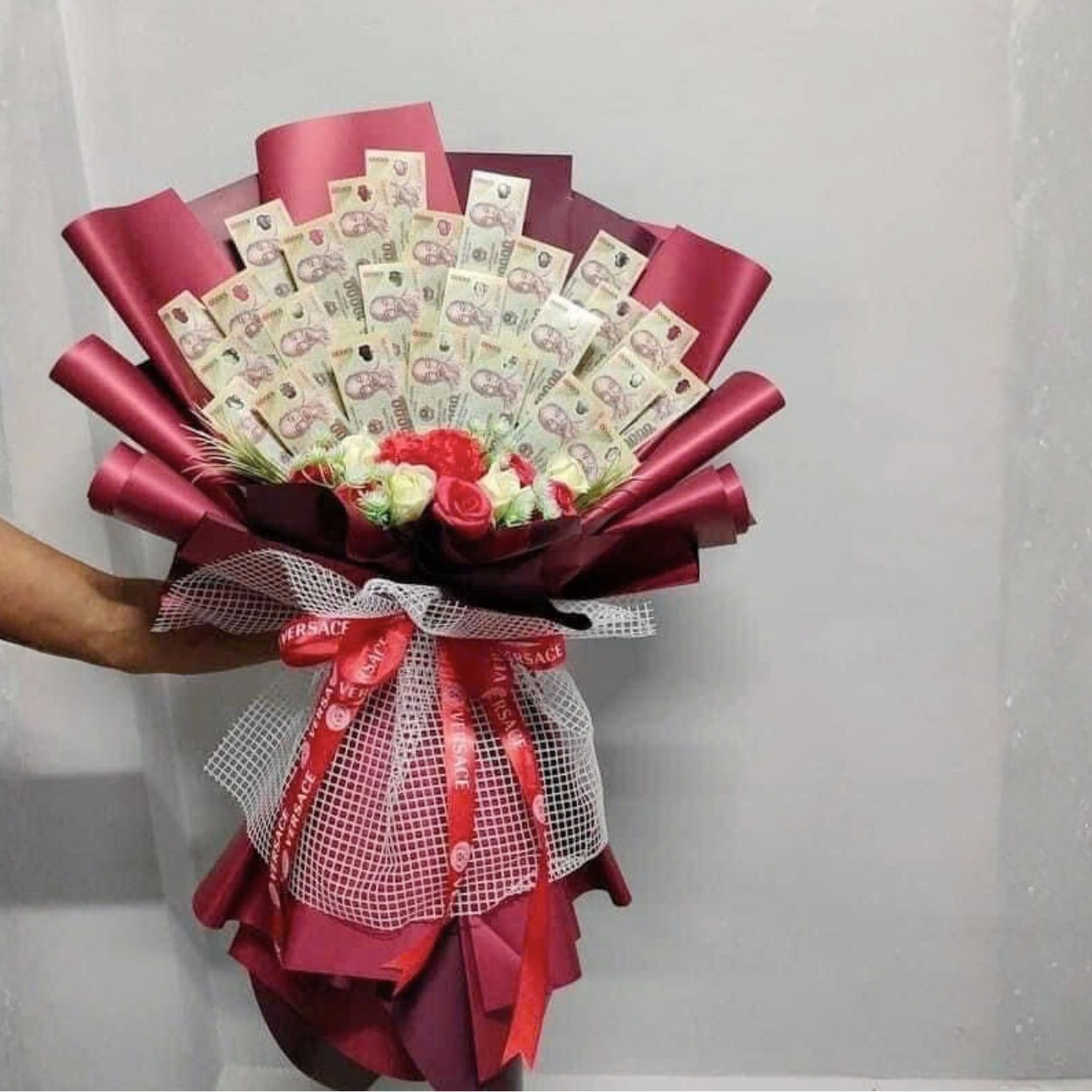“Sony” không chỉ đơn giản là một bó hoa, mà là sự sáng tạo đầy cảm hứng khi kết hợp giữa tờ tiền 10.000 đồng cùng những đóa hồng xanh và đỏ rực rỡ. Giấy gói sang trọng phối cùng lớp giấy lưới mềm mại tạo nên điểm nhấn đặc biệt, khiến tổng thể trở thành một món quà vừa độc đáo vừa thanh lịch.
