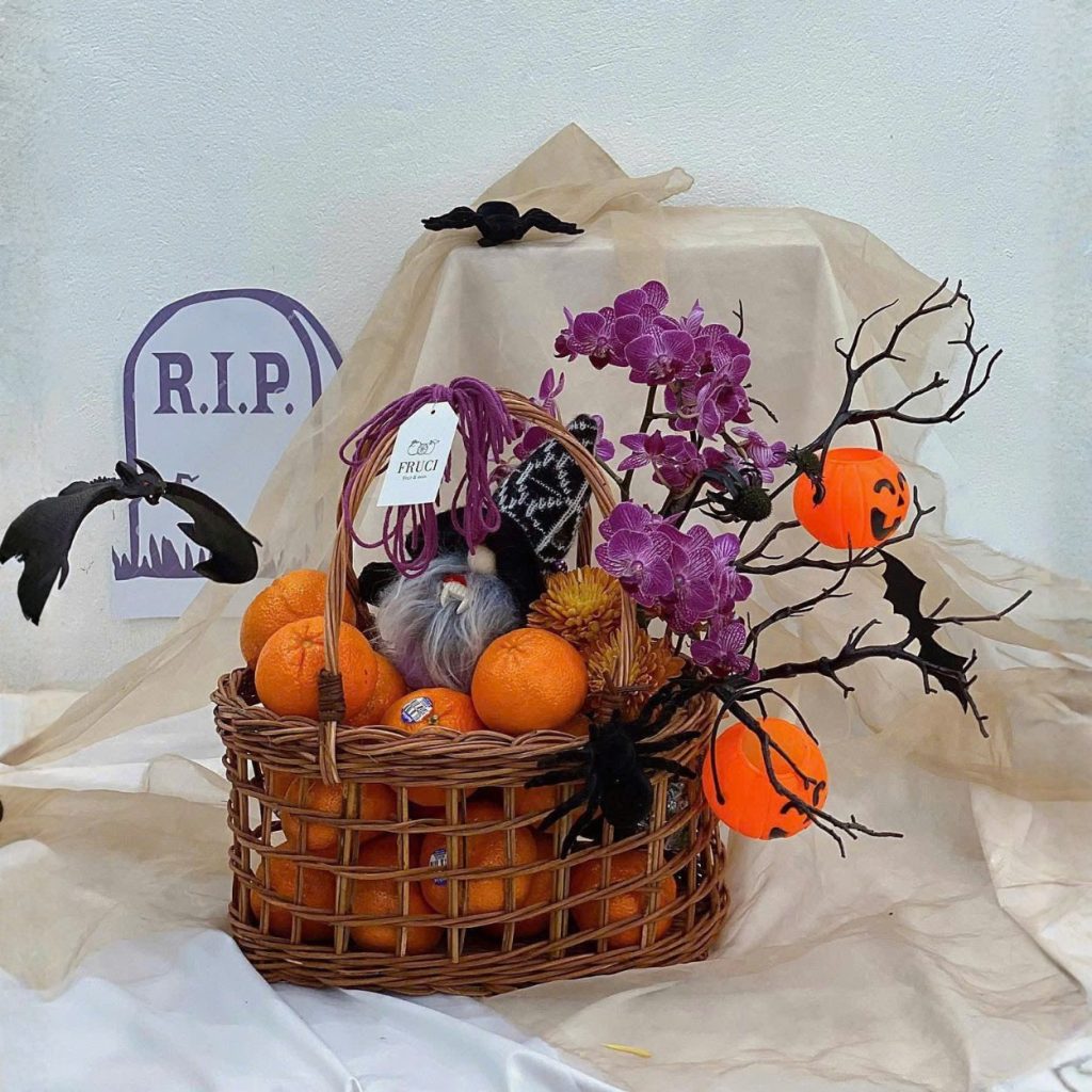 Giỏ Hoa Trái Cây Spooky seasonBố cục & màu sắc: ma mị nhưng cân bằng
