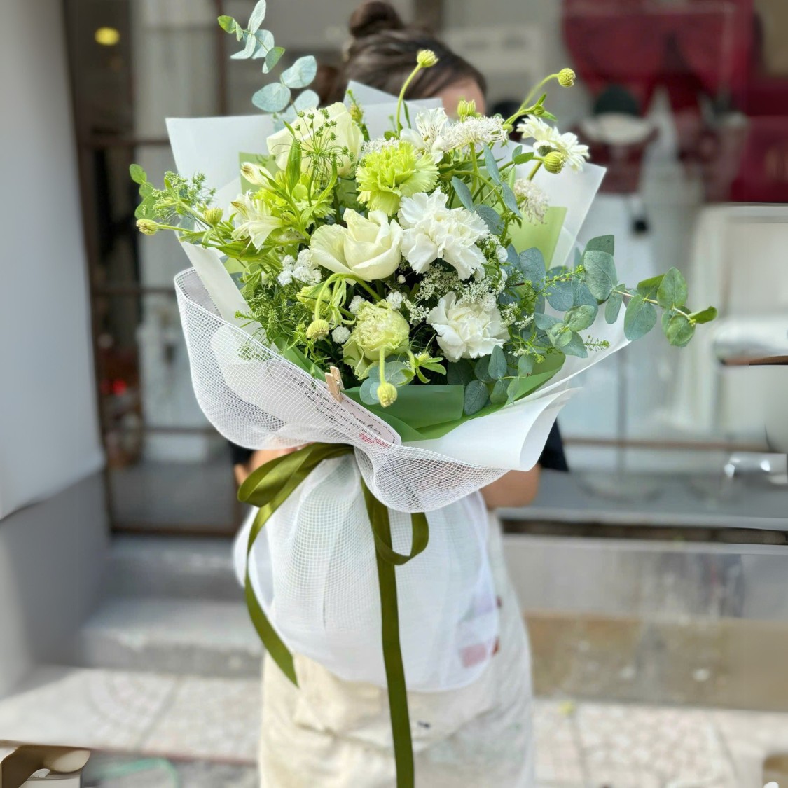 Toàn bộ bó hoa được gói bằng lớp giấy xi măng màu trung tính, kết hợp giấy lót trang trí tone be nhạt hoặc xám tro, tôn vinh sự tinh giản đầy hiện đại. Không cần quá nhiều chi tiết cầu kỳ, bó hoa này thể hiện đúng tinh thần: “Tri ân bằng sự chân thành, không cần phô trương”.