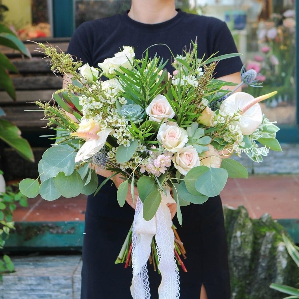 Bó hoa không bó chặt, không ép khuôn, tạo cảm giác tự do và bay bổng. Các chi tiết như lá xanh, baby trắng hoặc lúa mạch được điểm xuyết nhẹ nhàng, làm cho tổng thể trở nên sống động và hài hòa. Đây là lựa chọn lý tưởng cho cô dâu yêu phong cách tự nhiên, gần gũi và muốn mang theo một chút “hơi thở đồng quê” đến buổi lễ thiêng liêng của mình.