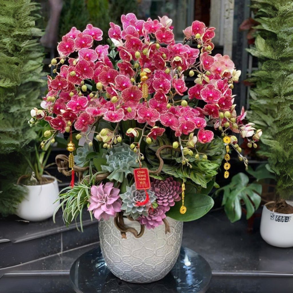 Điểm nhấn chính là hoa lan hồ điệp chấm bi màu hồng đỏ đậm – màu sắc mang lại sự phú quý, may mắn và đầy sức sống. Cùng với đó, những cụm sen đá đa sắc và cây lan chi xen kẽ tạo nên sự mềm mại và sinh động. Lá phụ to bản màu xanh đậm làm nổi bật phần hoa chính, đồng thời giữ cho tổng thể hài hòa, tự nhiên.