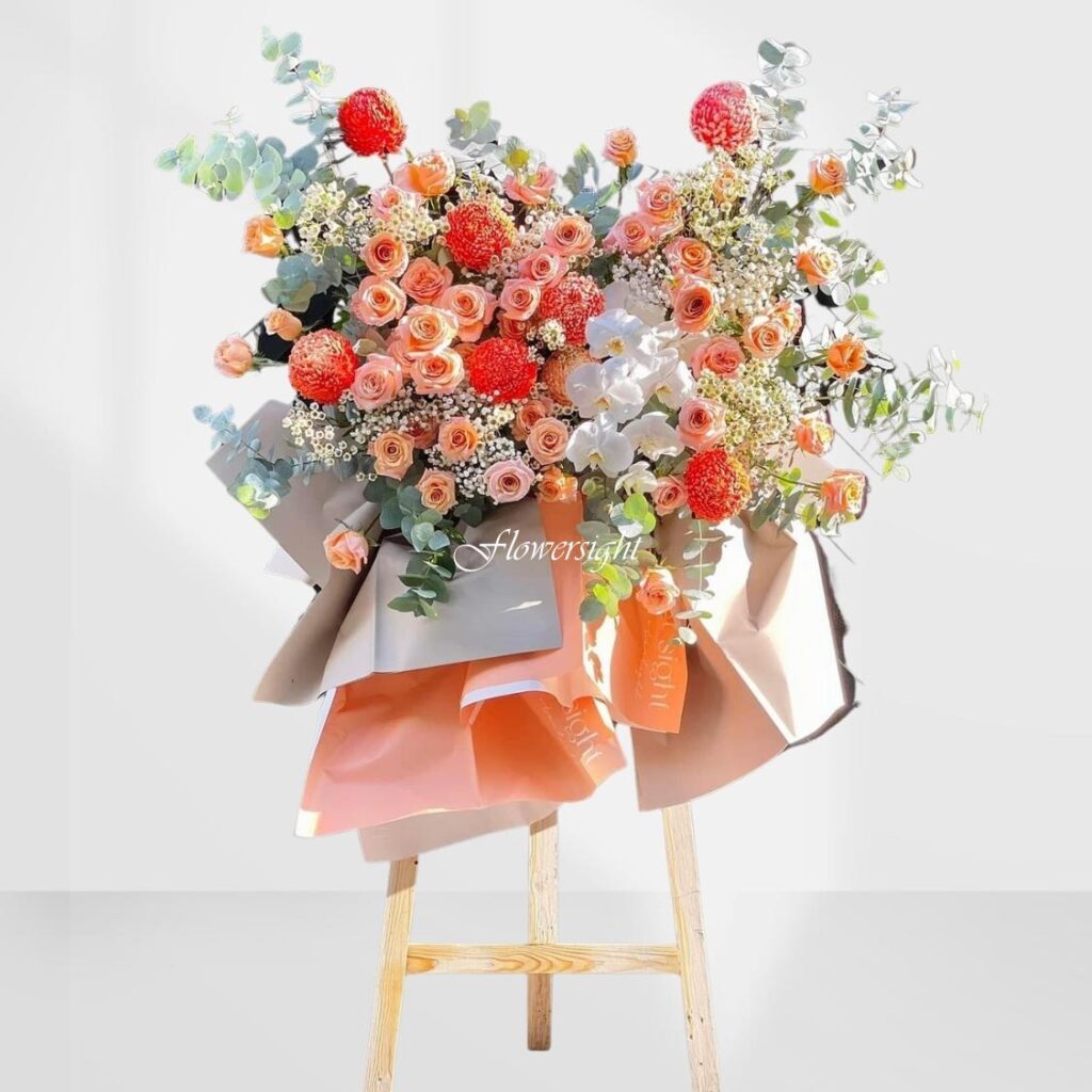Kệ hoa “Sung Túc” được tạo nên từ các loài hoa cao cấp như hoa lan, hồng đỏ, cẩm tú cầu, cùng các nhánh lá xanh mướt. Màu sắc chủ đạo như đỏ, vàng, cam mang lại sự tươi mới và nổi bật, đồng thời tượng trưng cho tài lộc, thịnh vượng và sự phát triển mạnh mẽ. Đặc biệt, thiết kế kệ hoa hài hòa và sang trọng giúp không gian khai trương thêm phần long trọng, mang đến thông điệp về một tương lai đầy hứa hẹn.