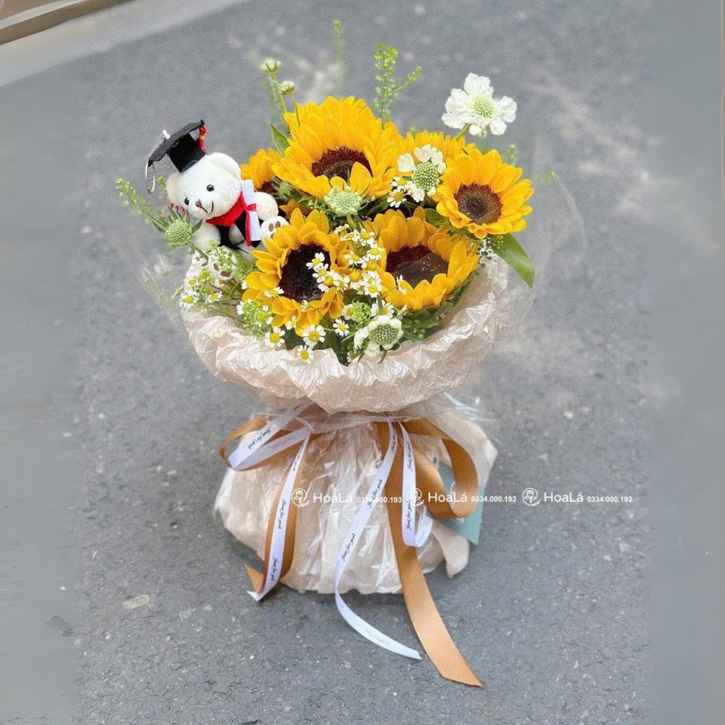 Ngay từ ánh nhìn đầu tiên, Thanh Xuân mang lại cảm giác trong trẻo và đầy năng lượng. Gấu bông êm ái được đặt làm trung tâm, tạo cảm giác ôm ấp thân thiện. Vòng hoa hướng dương bao quanh mở mặt đều, đón sáng rõ ràng để sắc vàng tỏa ra như một vệt nắng. Ở các khoảng chuyển, cát tường cánh mỏng chen nhẹ, thêm độ mềm và nhịp thở cho tổng thể. Tana trắng được rải vừa tay như lớp sương mịn, giúp làm dịu sắc độ và mở rộng trường nhìn mà không làm rối bố cục.