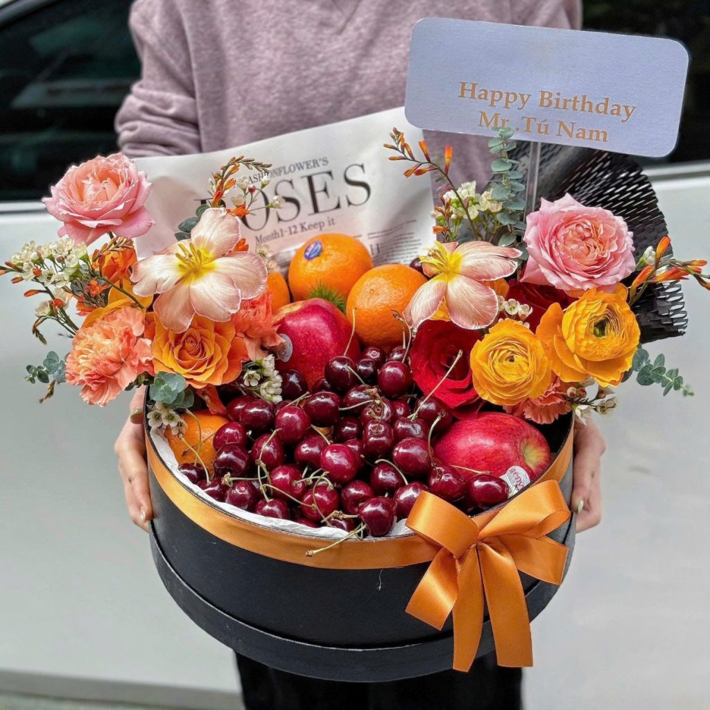 - Hộp & nơ: hộp tròn đen mờ giúp màu trái cây – hoa bật lên; nơ bản to tạo điểm chốt thị giác ở góc phải, khiến tổng thể gọn gàng và sang.