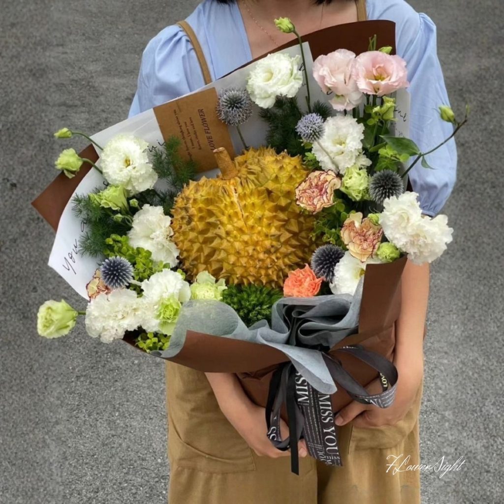 Mạnh mẽ nhưng vẫn tinh tế — đó là ấn tượng đầu tiên khi chạm mắt Thunder Thorns. Ở tâm điểm là trái sầu riêng vàng óng, lớp gai đều tăm tắp như vương miện sấm sét, được “làm dịu” bằng viền hoa cát tường trắng bồng bềnh và cẩm chướng loang màu cam – hồng. Điểm xuyết là những cụm wicky xanh thép tròn mọng, tạo nhịp điệu thị giác hiện đại. Toàn bộ được nâng đỡ bởi hai lớp giấy gói trắng – nâu gấp nếp chỉn chu, kết thúc bằng nơ ruy-băng đen chữ trắng đầy phong thái. Một layout táo bạo, hài hòa, khiến người nhận phải mỉm cười ngay khi mở gói.