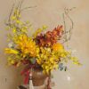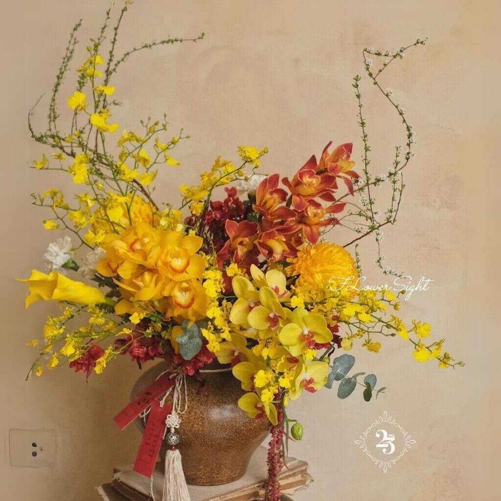 Màu vàng chủ đạo trong bình hoa gợi lên sự ấm áp, hy vọng và thành công trong năm mới. Sắc vàng tượng trưng cho nguồn năng lượng dồi dào, sự phồn thịnh và những khởi đầu tốt đẹp.