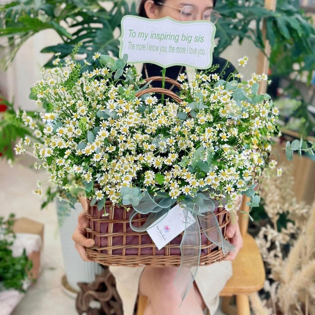 Giỏ hoa này được làm chủ yếu từ hoa cúc tana, loài hoa mang vẻ đẹp giản dị nhưng đầy sức sống. Hoa cúc tana, với những cánh hoa nhỏ xinh và màu sắc tươi sáng, tượng trưng cho sự trong sáng và thuần khiết của tình yêu.