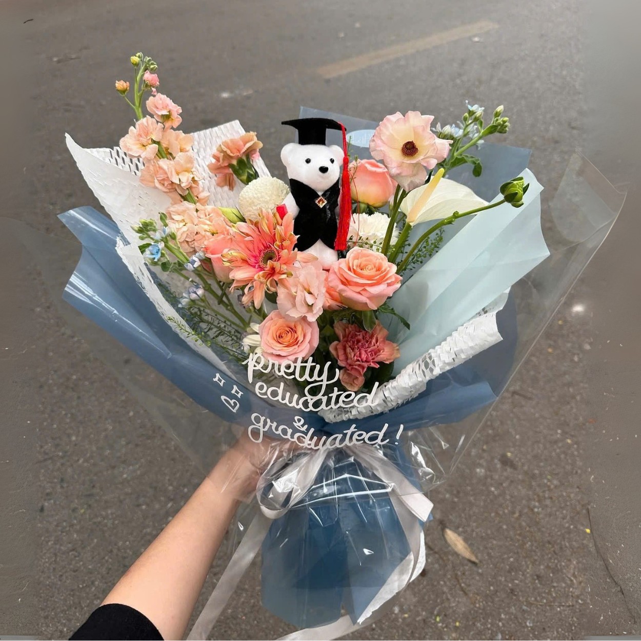 Mỗi hành trình đều để lại một dấu vệt dịu dàng. Với Trải Qua, tôi chọn kể câu chuyện đó bằng gấu bông ôm khẽ giữa lòng hoa, bao quanh là hoa hồng và những cánh hồng shimmer ánh ngọc. Ở tầng điểm nhấn, đồng tiền xoắn mở ra từng vòng cánh khỏe khoắn như nhắc nhớ về nghị lực. Tổng thể là một bó hoa gấu nhẹ nhàng nhưng đủ sâu, dành cho người trân trọng cả điều đã qua và điều đang tới.