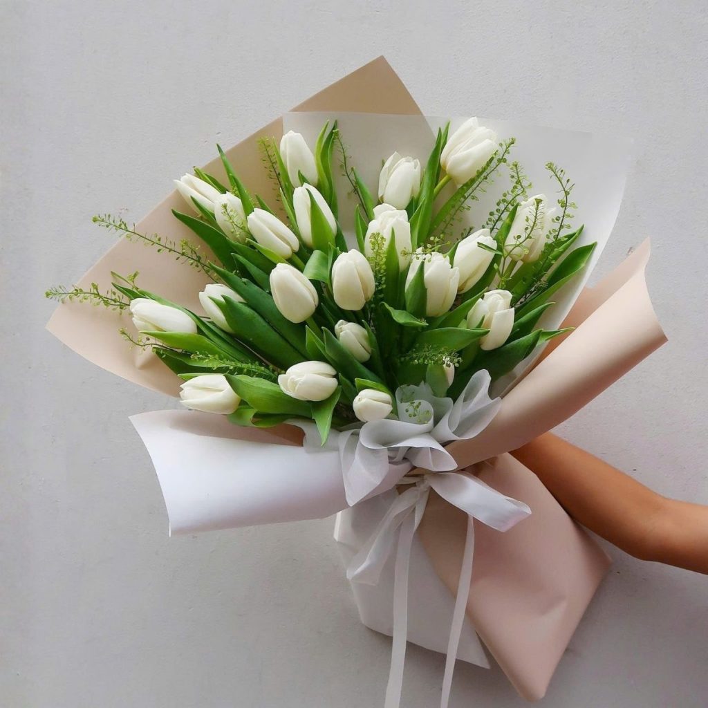 Điểm đặc biệt của “Tự Do” nằm ở cách cắm hoa nhẹ nhàng, phóng khoáng. Các bông tulip được sắp đặt tự do nhưng vẫn cân đối, tạo nên cảm giác như hoa đang vươn mình trong gió sớm. Lớp giấy gói chọn gam màu trung tính giúp làm nổi bật màu hoa, trong khi chiếc nơ mềm mại điểm xuyết nét tinh tế và nữ tính. Toàn bộ bố cục như một bản giao hưởng thị giác giữa sự tự do và trật tự.