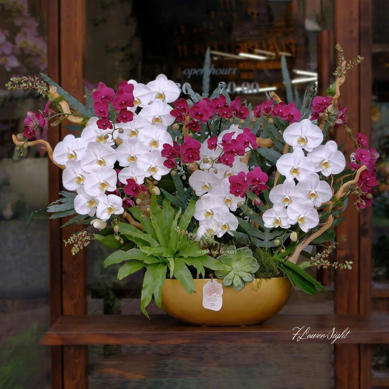 Chậu lan tím pha trắng là lựa chọn hoàn hảo để bày tỏ lòng biết ơn và tình cảm dành cho những người phụ nữ, thầy cô đáng kính. Mỗi chi tiết từ chậu lan hồ điệp 6 cành, sen đá, lá bạc đến hồng sâm đều mang thông điệp trân trọng và yêu thương.