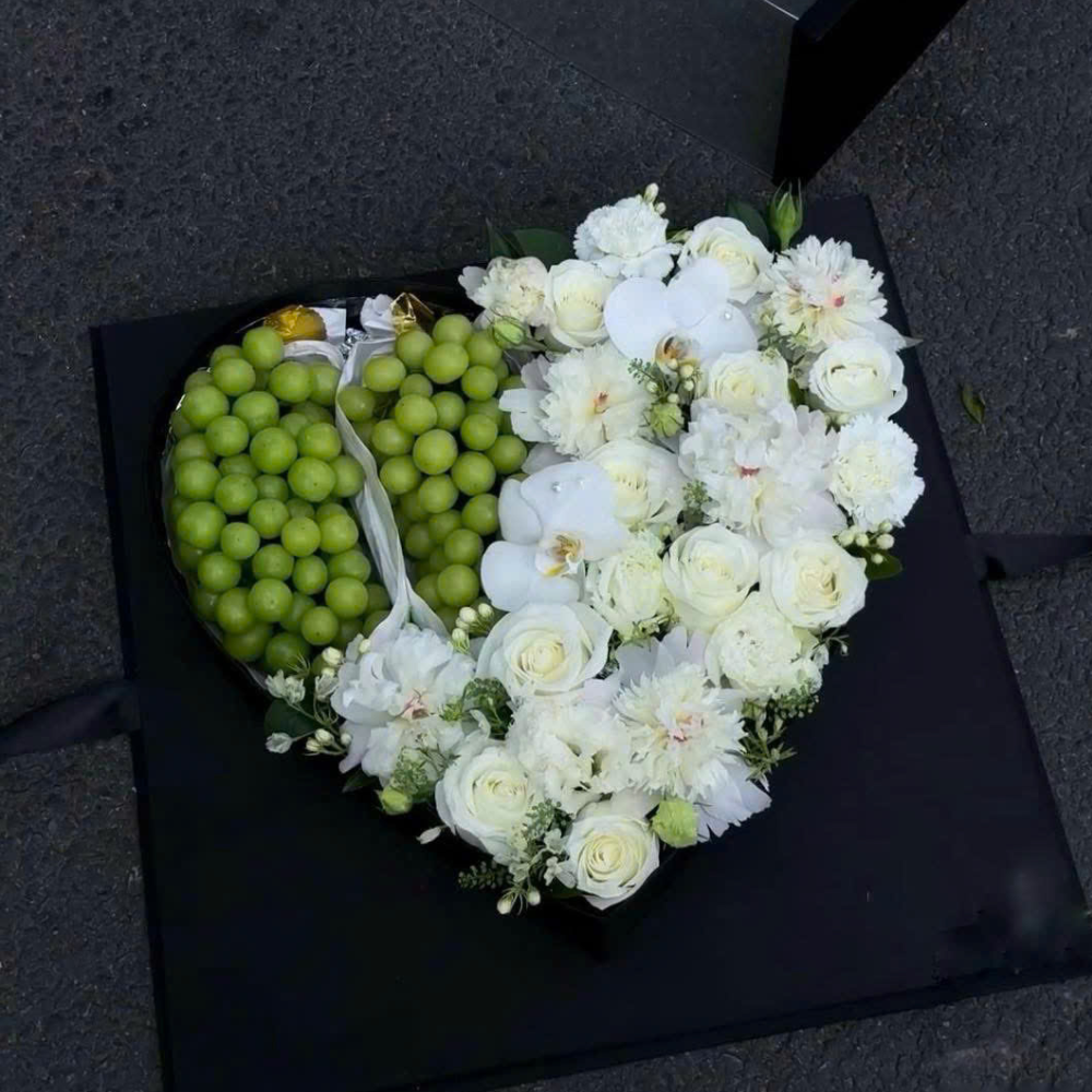 Bố cục trái tim đặt trong hộp cao cấp phủ đen mờ, nơ satin đồng điệu, tôn toàn bộ ánh xanh của nho và sắc trắng của hoa. Phần trái cây sử dụng nho tươi được lót giấy bạc thực phẩm để giữ vệ sinh và độ giòn ngọt. Cụm hoa phủ nửa còn lại gồm hoa hồng trắng làm nền, điểm nhấn lan hồ điệp bản to ở đỉnh tim tạo “điểm rơi thị giác”, xen lớp cát tường bung nở mềm như mây. Lá phụ tiết chế, chủ đạo là mảng xanh nhỏ mịn nhằm giữ nhịp tối giản, không lấn át sắc trắng. Đường chia hai nửa được xử lý bằng dải ruy băng uốn cong mềm—một “vệt sáng” ngăn giữa ngọt lành và tinh khiết, khiến tổng thể liền mạch và hiện đại.