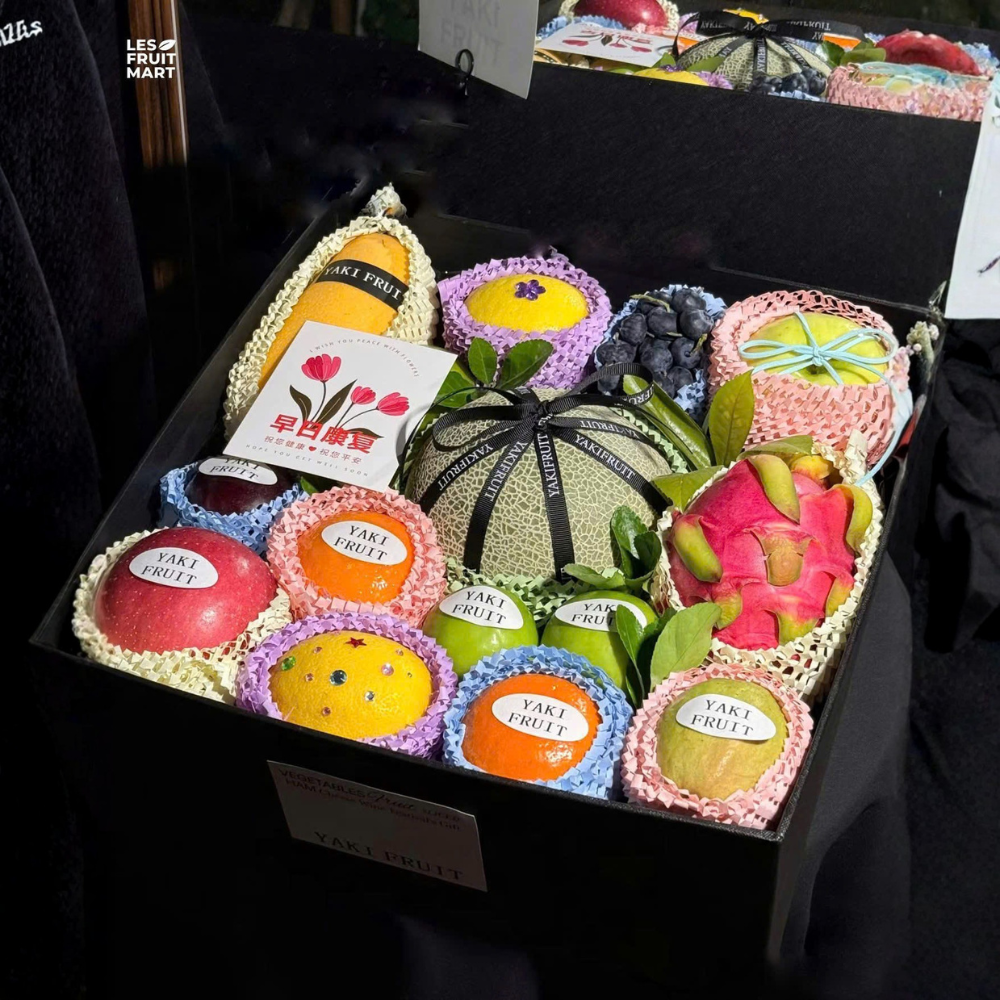 Ngay từ ánh nhìn đầu tiên, “Unsure” chinh phục bằng vẻ sang trọng của một hộp quà tông đen – nền tối làm bệ phóng cho màu trái cây tỏa sáng. Ở trung tâm là dưa gang lưới được cột ruy-băng bản vừa, tạo cảm giác như “viên ngọc” của hộp quà. Bao quanh là những gam sắc mọng nước: xoài vàng, cam căng bóng, thanh long hồng rực, táo xanh mát mắt, chấm phá bởi việt quốc xanh đen. Mỗi quả đều được lót lưới màu pastels, vừa bảo vệ vừa tăng hiệu ứng thị giác, khiến tổng thể tinh tế mà vẫn rất “ngon mắt”.