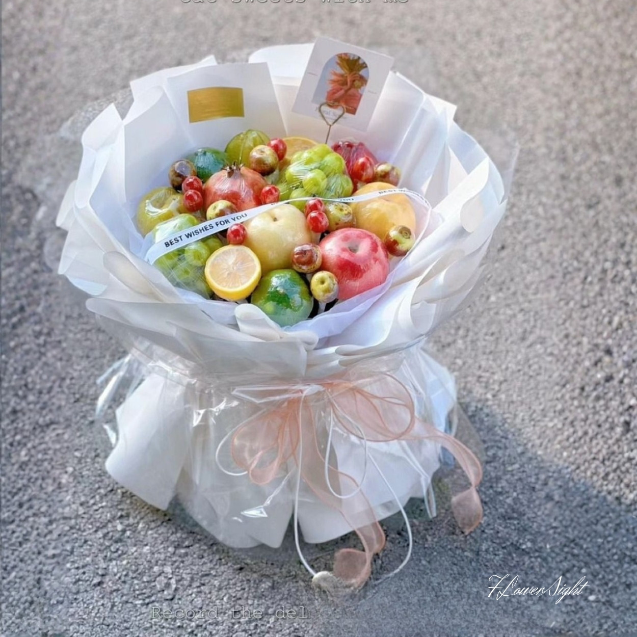 Valentina là cách tôi kể câu chuyện về sự tươi mới bằng trái cây. Trên nền giấy gói trắng tinh khiết, từng quả nho căng mọng, táo sáng bóng, cam chín thơm, lựu đỏ quyến rũ và khế xanh mát được sắp đặt theo bố cục vòm tròn cân đối. Một chiếc nơ trắng hồng nhẹ nhàng khép lại tổng thể, tạo cảm giác trong trẻo và trang nhã ngay từ cái nhìn đầu tiên. Bó hoa trái cây này không chỉ đẹp, mà còn chạm tới xúc giác và khứu giác, để mỗi lần mở lớp giấy là một lần gặp lại mùi vị dịu ngọt của bốn mùa.