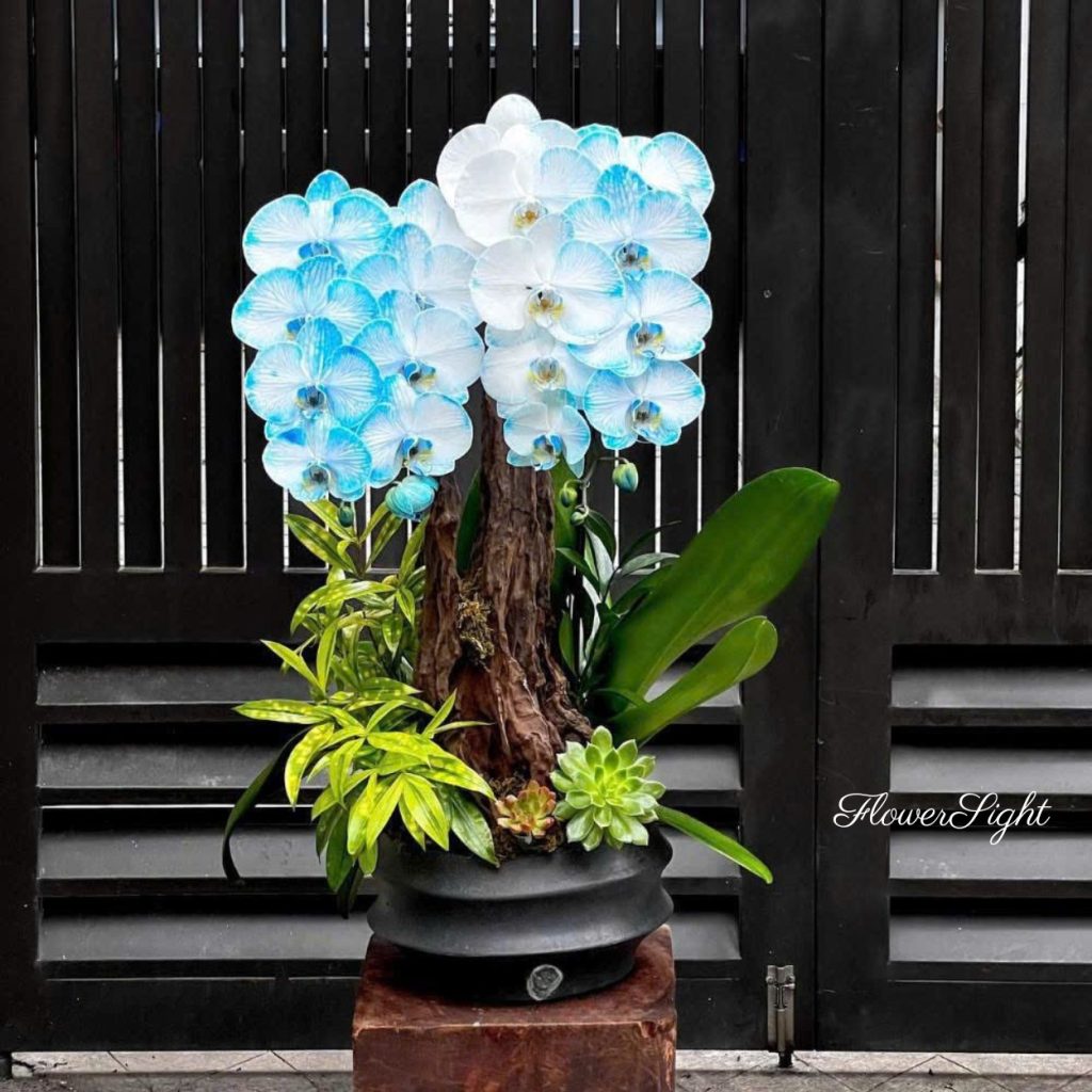 Chậu hoa Velvet Moon Orchid được bố trí hài hòa, kết hợp lá và lá tùng mềm mại, tạo tổng thể vừa thanh thoát vừa tinh tế. Mỗi chi tiết đều được chăm chút tỉ mỉ, từ cách sắp xếp lá đến bố trí tổng thể, giúp chậu hoa trở nên nổi bật nhưng vẫn nhẹ nhàng, thanh lịch.