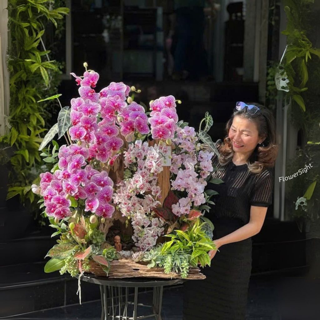 Chậu hoa Velvet Moon được sắp xếp hài hòa, kết hợp lan mềm mại, gỗ lũa mộc mạc và sen đá nhỏ xinh, tạo tổng thể vừa thanh thoát vừa sang trọng. Mỗi chi tiết đều được chăm chút tỉ mỉ, từ cách bố trí nhánh lan đến điểm xuyết gỗ lũa và sen đá, giúp chậu hoa vừa độc đáo vừa tinh tế. Thiết kế hài hòa này mang đến vẻ đẹp thanh lịch và gần gũi, khiến món quà trở nên đặc biệt, vừa thẩm mỹ vừa giàu cảm xúc.