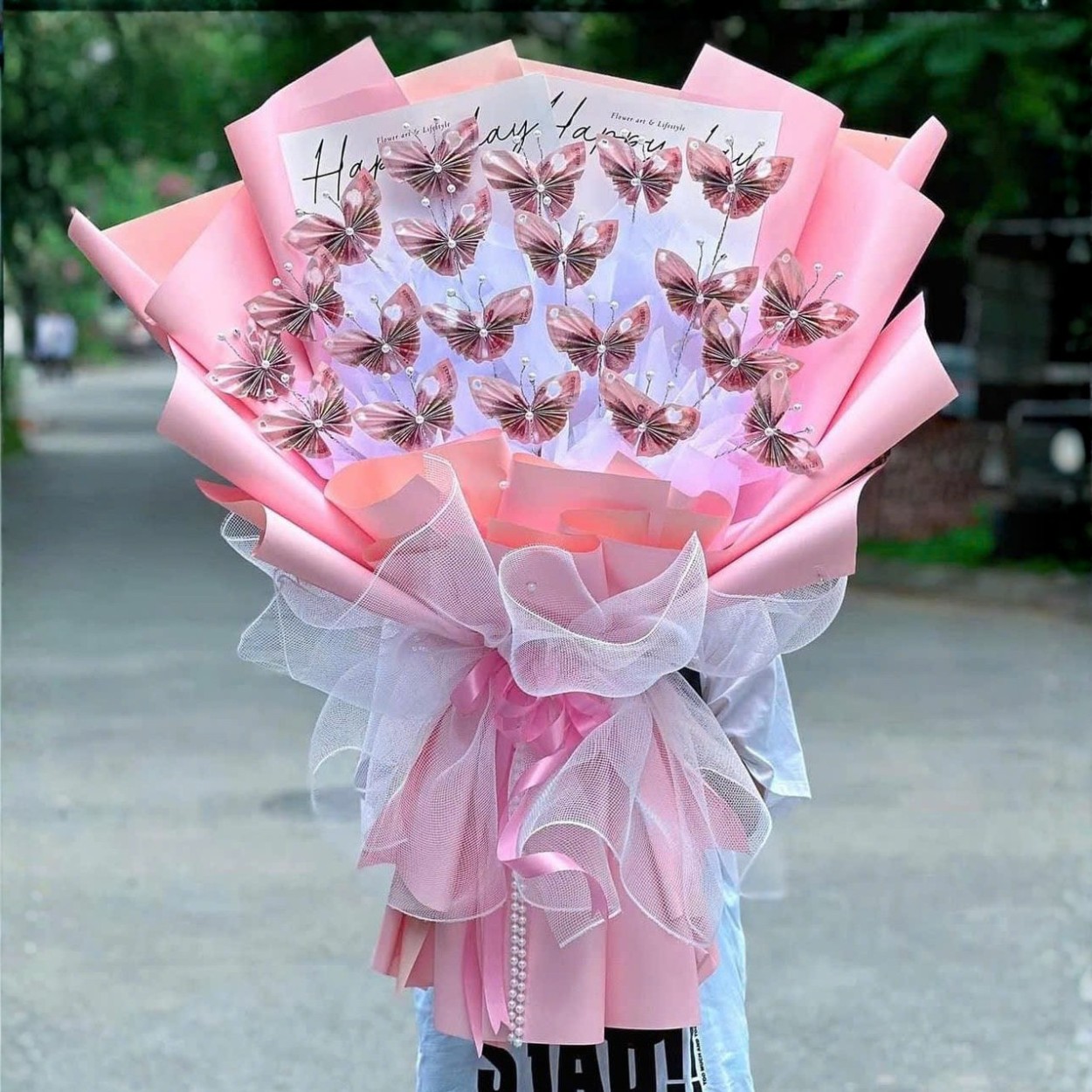 Verdant Grace là mẫu bó hoa sáp được tạo tác như một khúc ballet ngoài trời: những cánh bướm mỏng tang xếp lớp, chạm nhau bằng đầu nhụy đính ngọc trai nhỏ, bay nhè nhẹ trên nền hồng nhạt. Nhìn trực diện, bạn sẽ thấy cả bầu không khí trong trẻo mở ra – nhẹ nhàng nhưng có nhịp, tối giản mà không hề đơn điệu. Tông hồng pastel phủ đều từ giấy gói đến nơ giúp toàn bộ bó giữ cùng một “độ dịu”, còn mảng trắng bán trong ở trung tâm làm điểm thở, cho khối hoa sáng hơn và có chiều sâu.