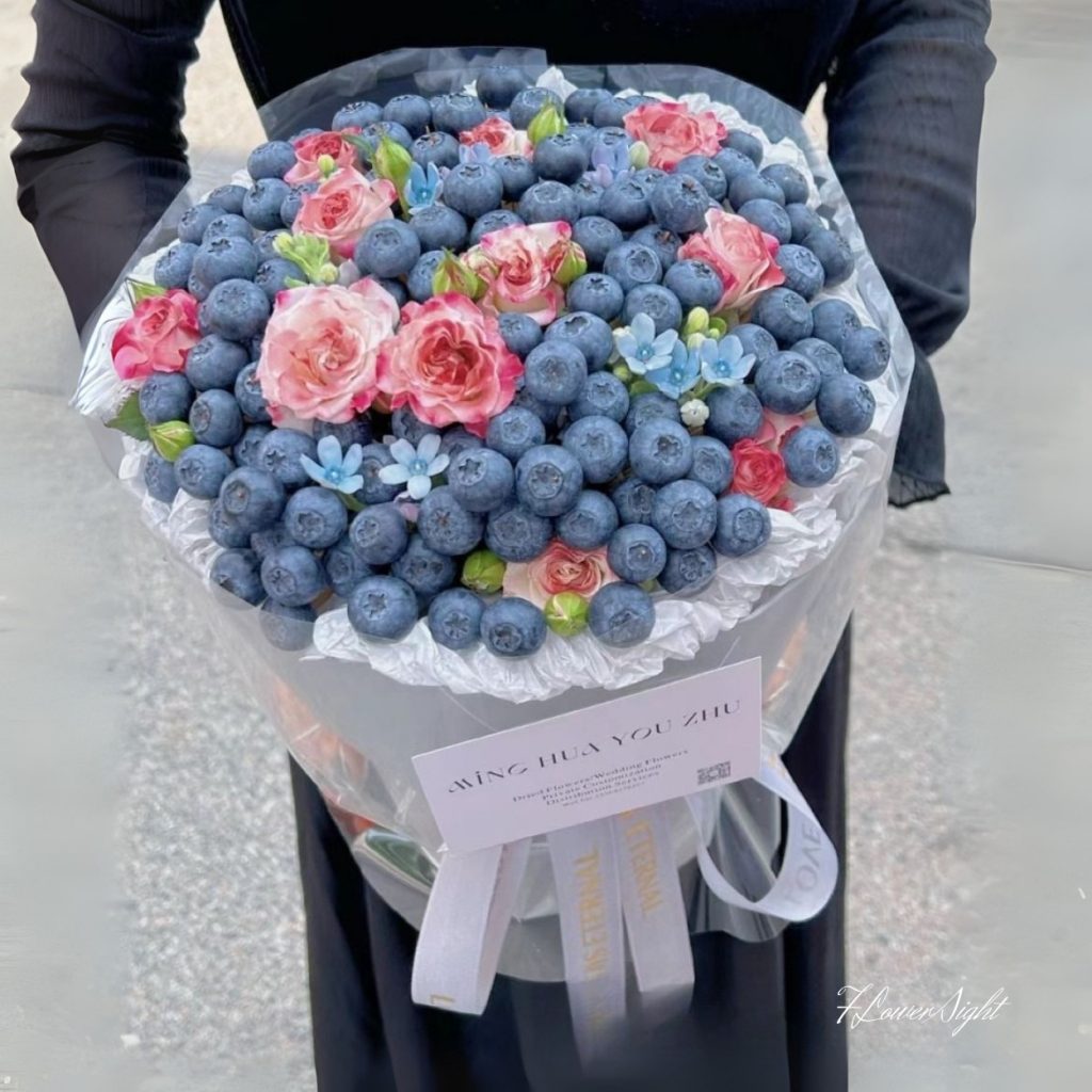 Bó hoa trái cây Việt quất nổi bật với việt quất tươi mọng, hoa hồng ngọt ngào, được gói bằng giấy bóng kính và dây nơ trắng tinh tế. Sản phẩm là lựa chọn lý tưởng để tặng khách hàng, sếp hay chị em trong các dịp đặc biệt, mang đến niềm vui, cảm xúc ngọt ngào và khoảnh khắc đáng nhớ.