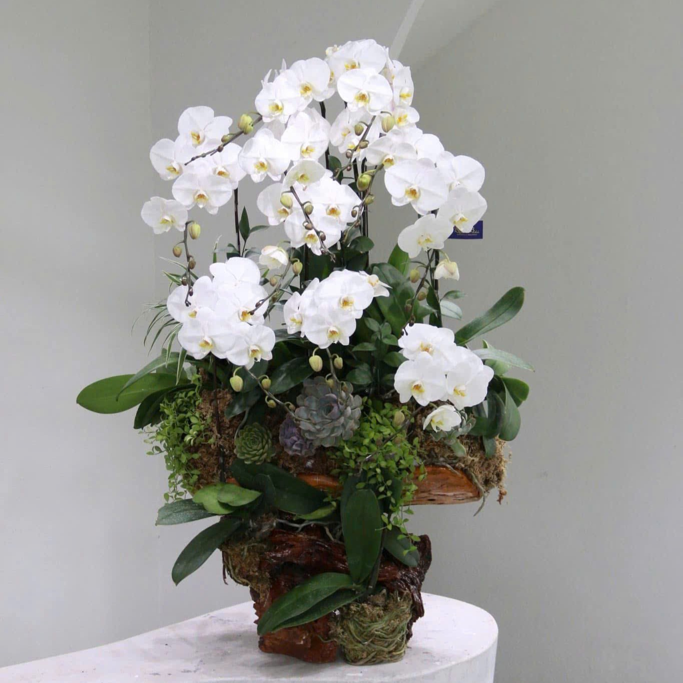 Vĩnh Cửu mang đến một thiết kế hài hòa giữa sắc trắng tinh khôi của lan, nét xanh mềm mại của dây thường xuân và vẻ tự nhiên của thân gỗ. Sự kết hợp này tạo nên chậu hoa vừa trang nhã vừa mang giá trị tinh thần, phù hợp để gửi gắm tình cảm trong những khoảnh khắc đáng nhớ.