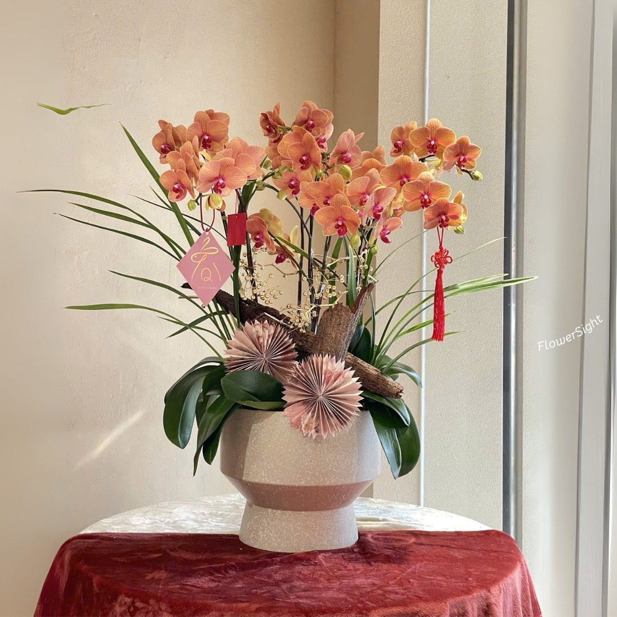 Trong dịp khai trương, chậu hoa này tượng trưng cho sự phát đạt và khởi đầu thuận lợi. Sự kết hợp giữa lan, khánh treo và gỗ lũa tạo nên bố cục sang trọng, đồng thời gửi gắm lời chúc tài lộc và thành công bền lâu. Chậu hoa lan hồ điệp nhiều cành không chỉ trang trí không gian mà còn tạo ấn tượng sâu sắc cho người nhận.