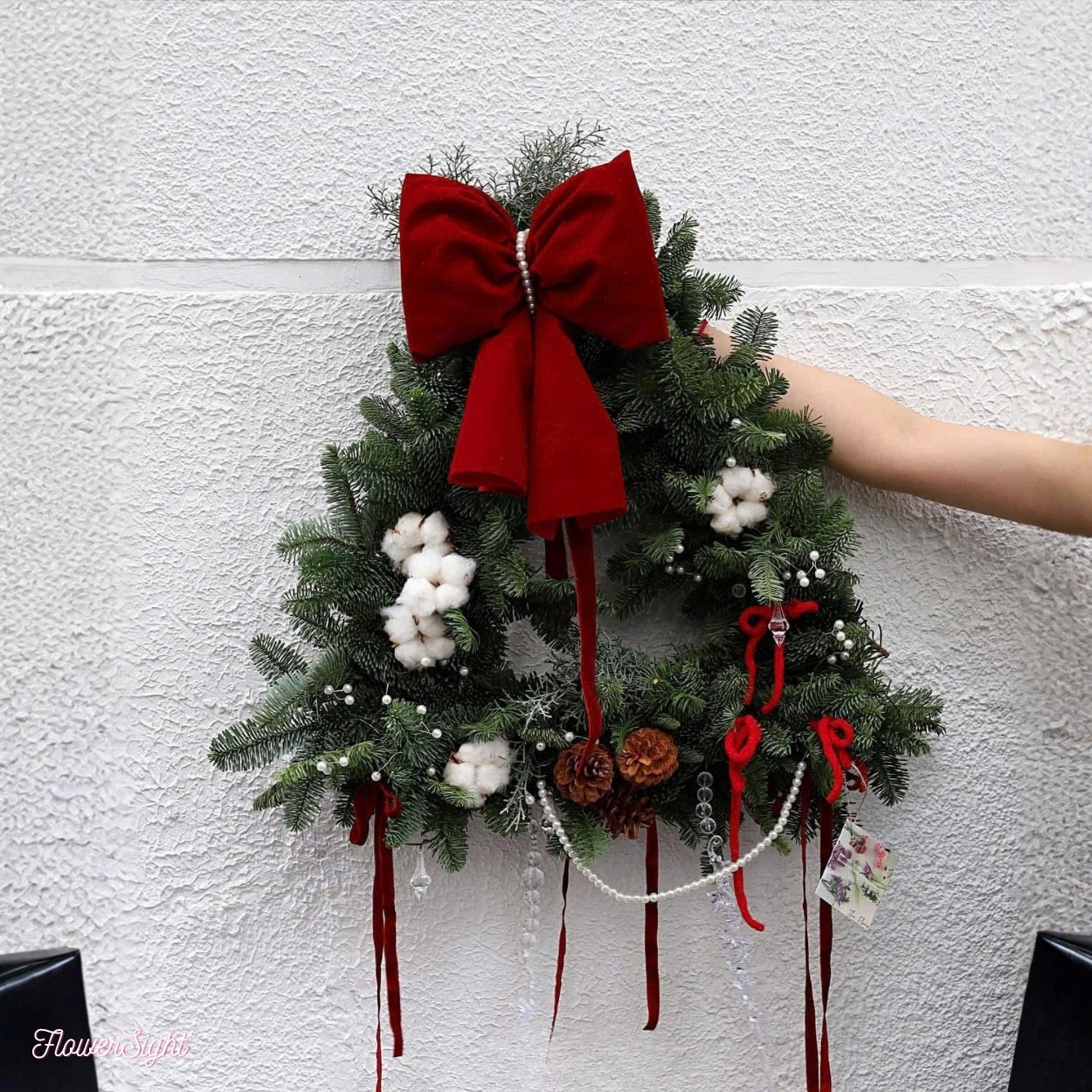 Chạm tay vào mùa lễ ngay ngưỡng cửa nhà bạn. “Vòng hoa Noel” của FlowerSight là một thiết kế dùng lá thông tươi kết thành form tròn cân đối, điểm bông gòn trắng như những mảng tuyết đầu mùa, trái thông nâu ấm, dây ngọc và pha lê lấp lánh. Tất cả được buộc nút bằng chiếc nơ nhung đỏ trầm, bản lớn – điểm nhấn thị giác khiến người nhìn muốn dừng lại lâu hơn. Mùi tinh dầu thông tự nhiên lan nhẹ, không gắt, cho cảm giác thư thái, sạch và rất “Giáng Sinh”.