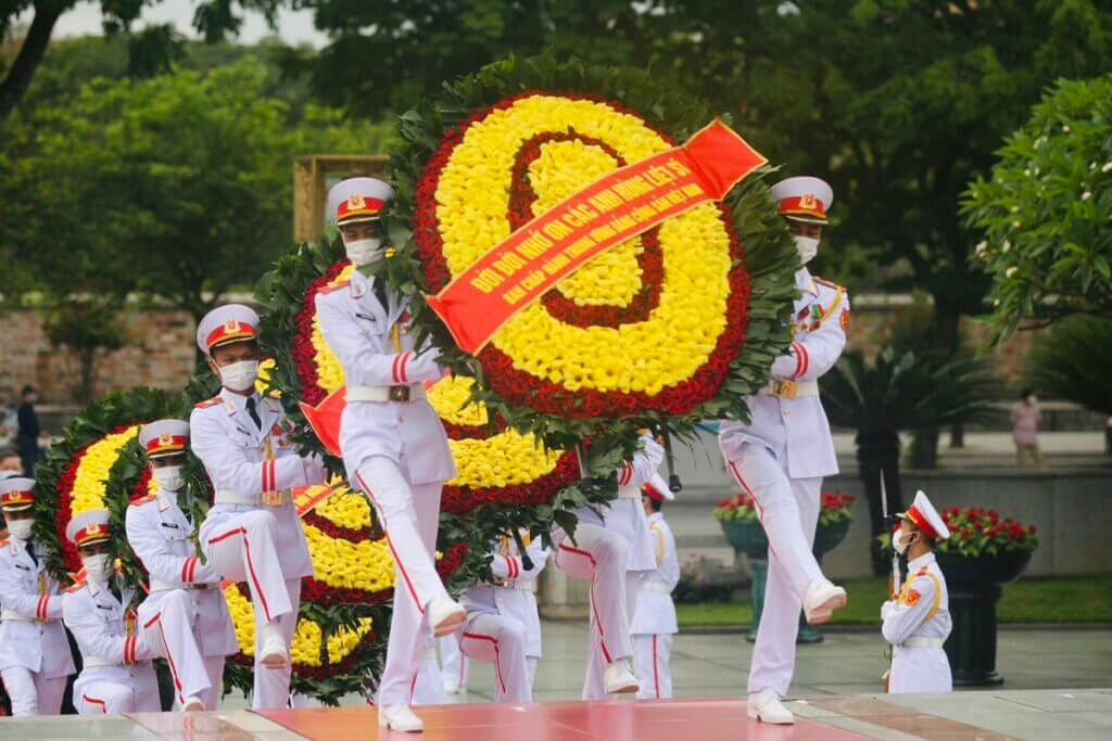 - Các thiết kế bó hoa, vòng hoa, lẵng hoa hay kệ hoa cần đề cao sự trang nhã, có thể sử dụng màu sắc hay tạo hình cờ đỏ sao vàng để thêm phần ý nghĩa.