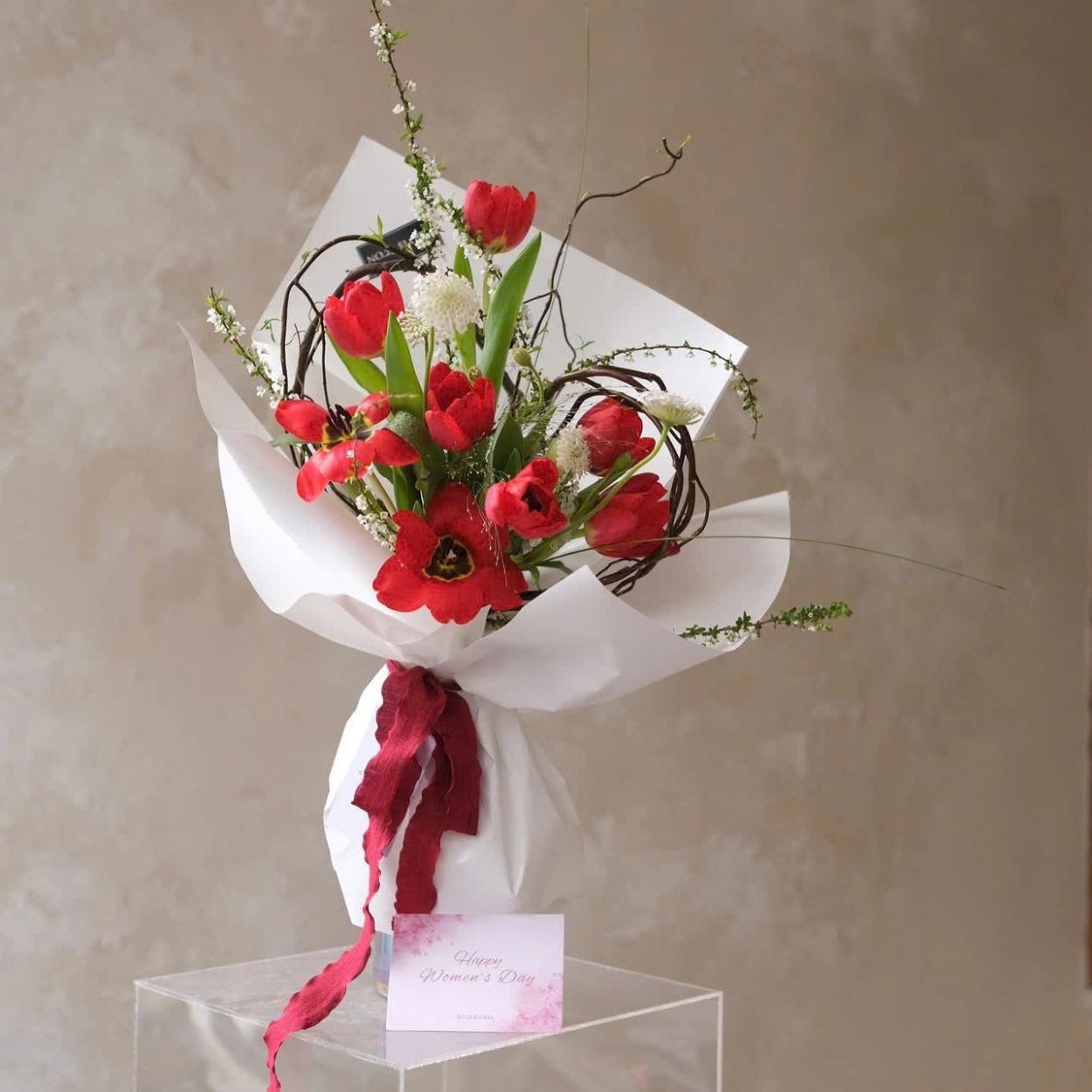Lớp giấy gói trắng phồng nhẹ được xử lý nếp gấp khéo, giúp bó hoa đứng dáng và thoáng khí. Nơ vải đỏ bản lớn rơi tự nhiên thành dải, liên kết tông màu với tulip để khi đặt lên bàn hay nâng trên tay đều rất cuốn hút. Mọi chi tiết được lựa chọn nhằm giữ đúng tinh thần tự do nhưng có kiểm soát, phóng khoáng mà vẫn sang.