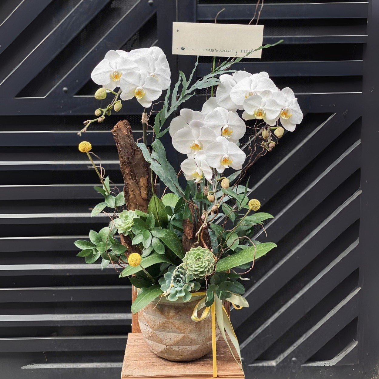 Vườn Hoa Tươi là sự phối hợp tinh tế giữa lan hồ điệp trắng thanh khiết cùng các chi tiết lá chanh xanh mướt, cúc nút áo dịu dàng, sen đá bền bỉ và sỹ bạc duyên dáng. Điểm nhấn bằng lũa gỗ tự nhiên tạo nên vẻ mộc mạc, ấm áp, mang lại cảm giác gần gũi và thư thái.