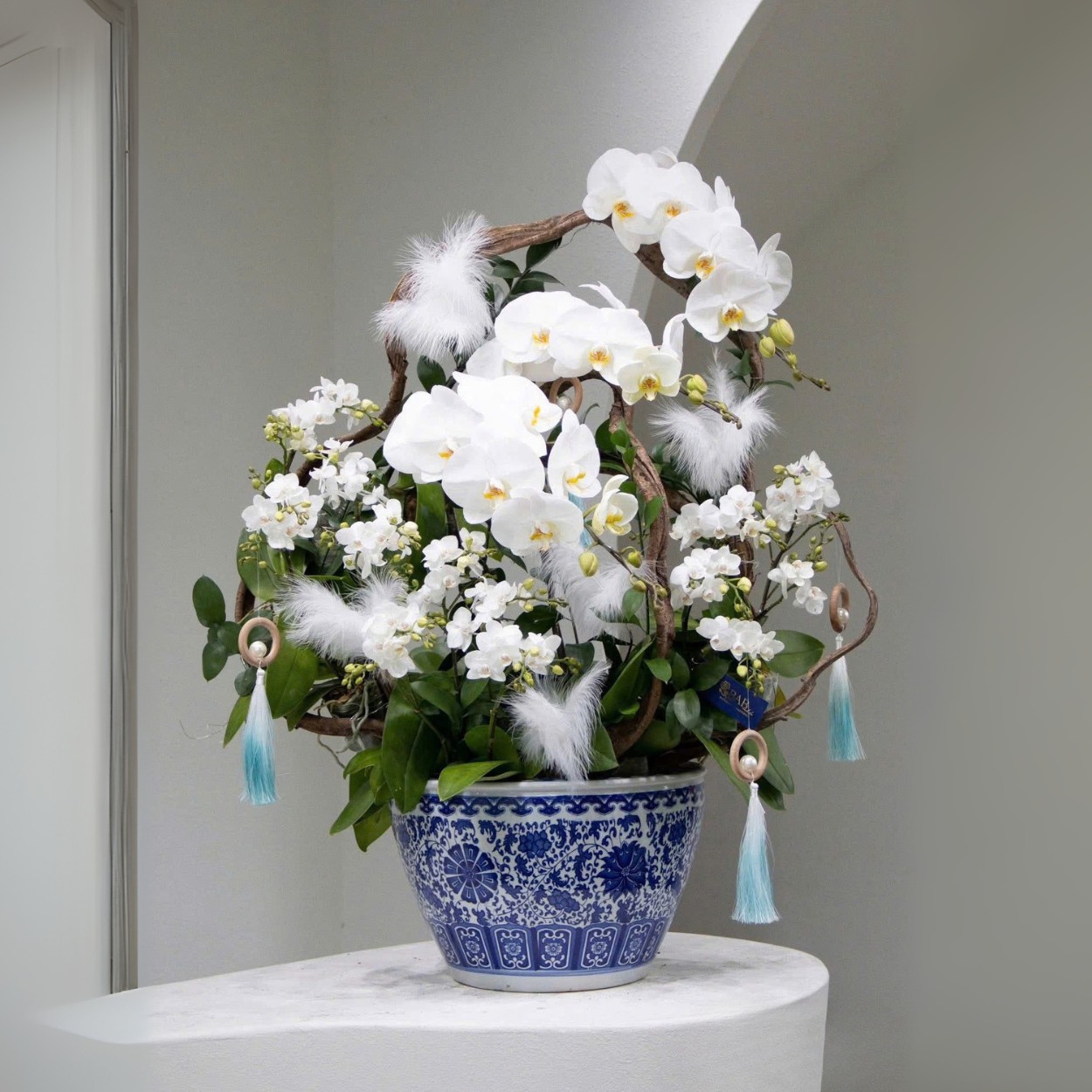 Vào những dịp khai trương, chậu hoa thể hiện lời chúc phát tài phát lộc, sự nghiệp thăng hoa. Sự phối hợp hài hòa giữa lan hồ điệp và khánh treo tạo cảm giác vừa trang trọng, vừa gần gũi, giúp không gian trở nên sinh động và tràn đầy sức sống.