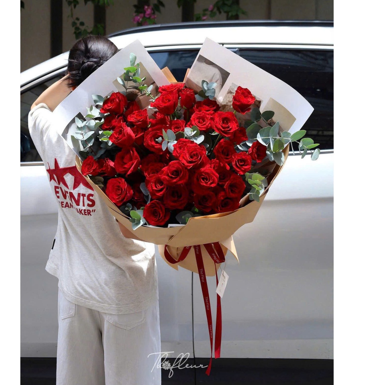 Giấy gói được chọn theo tông be – trắng, hoàn toàn trung tính để không tranh sắc với hoa. Những đường gấp vuông vức phía sau tạo cảm giác hiện đại, chỉnh chu và rất “ảnh đẹp”. Nơ đỏ buông dài tự nhiên, tạo chuyển động nhẹ giống như cơn gió lướt qua, giữ đúng tinh thần “Windy” của tên mẫu.