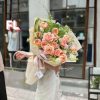 Bảng màu chủ đạo là cam đào mơ pha hồng phấn, trung hòa bằng xanh lá non và trắng ngà. Tông ấm giúp làn da người cầm trông sáng hơn khi lên ảnh, còn mảng trắng nhỏ đóng vai trò như ánh sáng phản quang, làm rõ kết cấu cánh hoa. Bố cục dạng tròn mở, cao dần về phía sau và thả nhẹ về phía trước, tạo hiệu ứng 3 chiều rõ nét. Nhìn từ mọi góc đều thấy các bông chủ được nâng đỡ bởi mảng lá phụ xanh mảnh, rất hợp gu tối giản mà vẫn thời thượng.