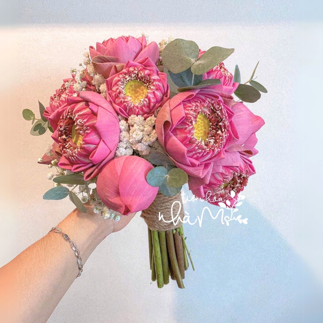 Hoa cưới sen hồng phù hợp cho các đám cưới mang phong cách truyền thống, làm tôn lên nét đẹp dịu dàng, thanh lịch của cô dâu nhưng không kém đi sự nổi bật.