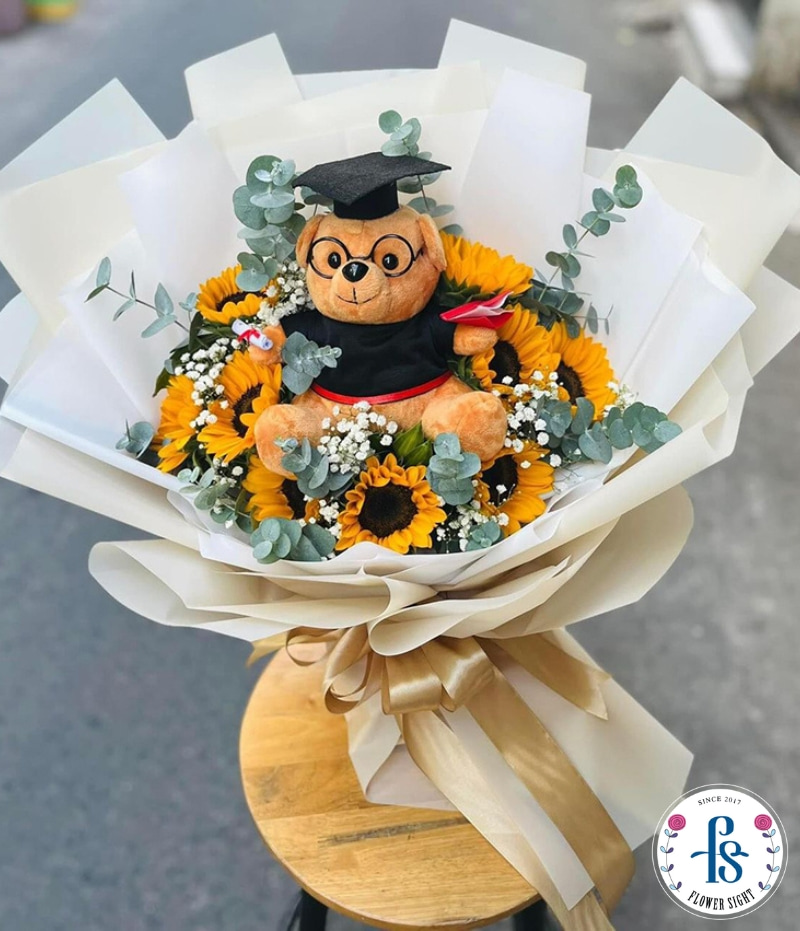 Bó hoa gấu bông tốt nghiệp là món quà chúc mừng thành công không thể ý nghĩa hơn trong ngày lễ ra trường. Đặc điểm nhận dạng của mẫu hoa này là những chú gấu bông được khoác lên mình bộ áo cử nhân và cầm tấm bằng tốt nghiệp tí hon. Đây là một lời chúc tuyệt vời, đánh dấu một chặng đường quan trọng và mở ra một tương lai tươi sáng.