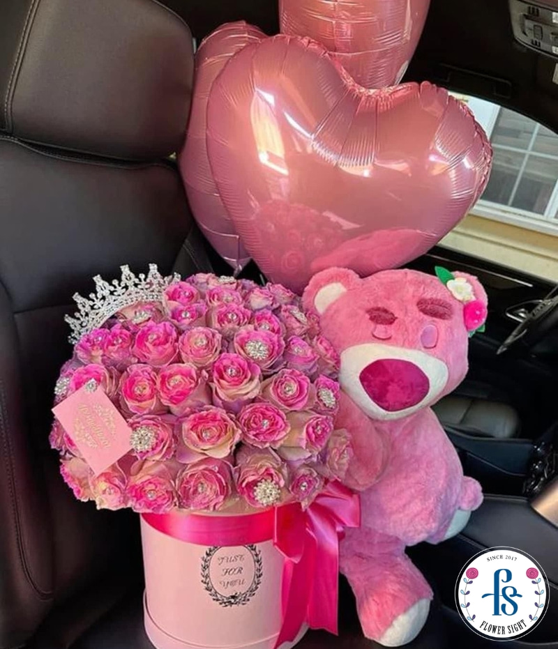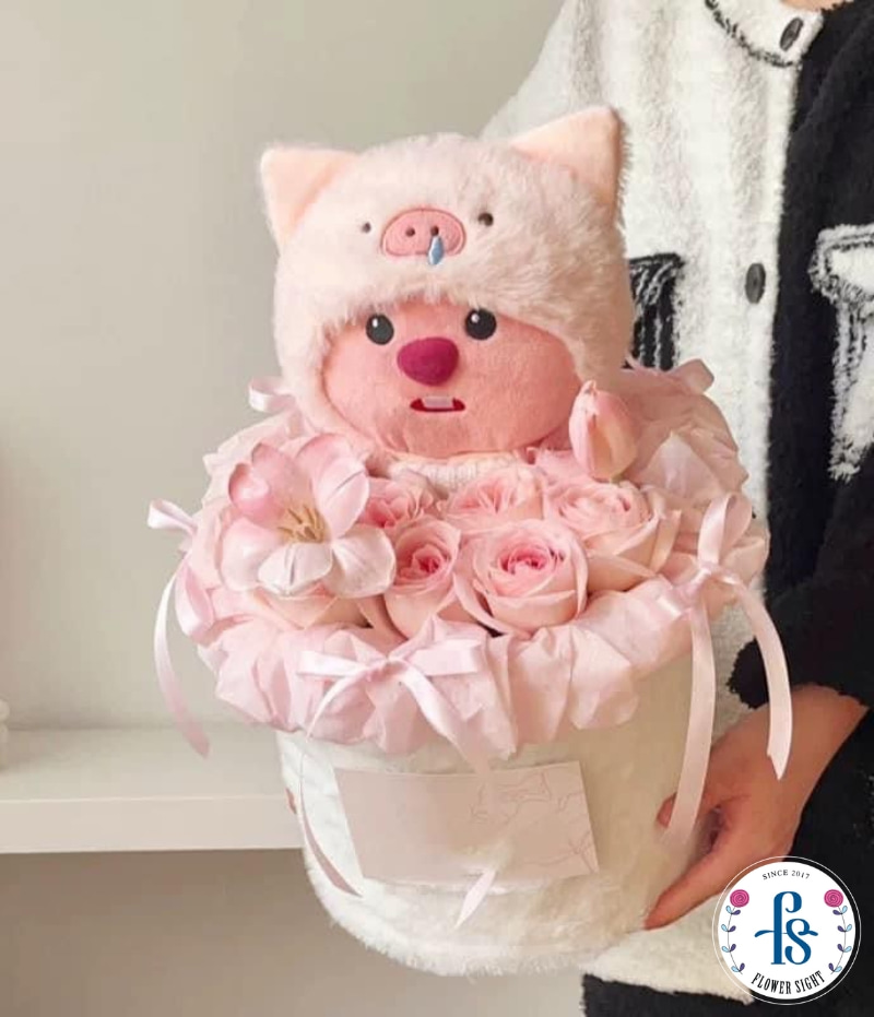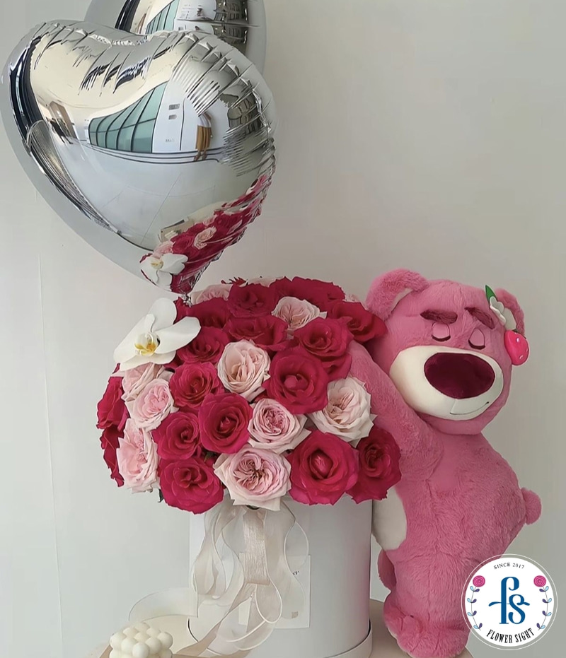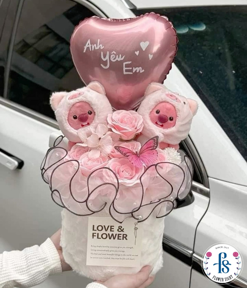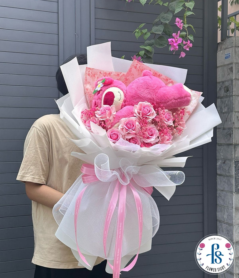Lấy cảm hứng từ nhân vật Gấu bông Lotso trong bộ phim hoạt hình “Toy Story” nổi tiếng, Bó hoa gấu Lotso chinh phục mọi cô gái bằng màu hồng đặc trưng và mùi hương dâu tây thoang thoảng. Món quà này không chỉ đáng yêu mà còn gợi lại những kỷ niệm tuổi thơ tươi đẹp.