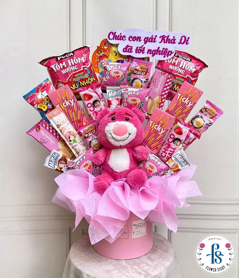 Một món quà nhân đôi sự ngọt ngào khi kết hợp sự dễ thương của gấu bông với vị ngon của các loại kẹo hay sô cô la được yêu thích. Mẫu hoa này không kén người nhận và phù hợp với nhiều dịp từ sinh nhật đến các ngày lễ, mang lại niềm vui và sự bất ngờ cho người nhận.