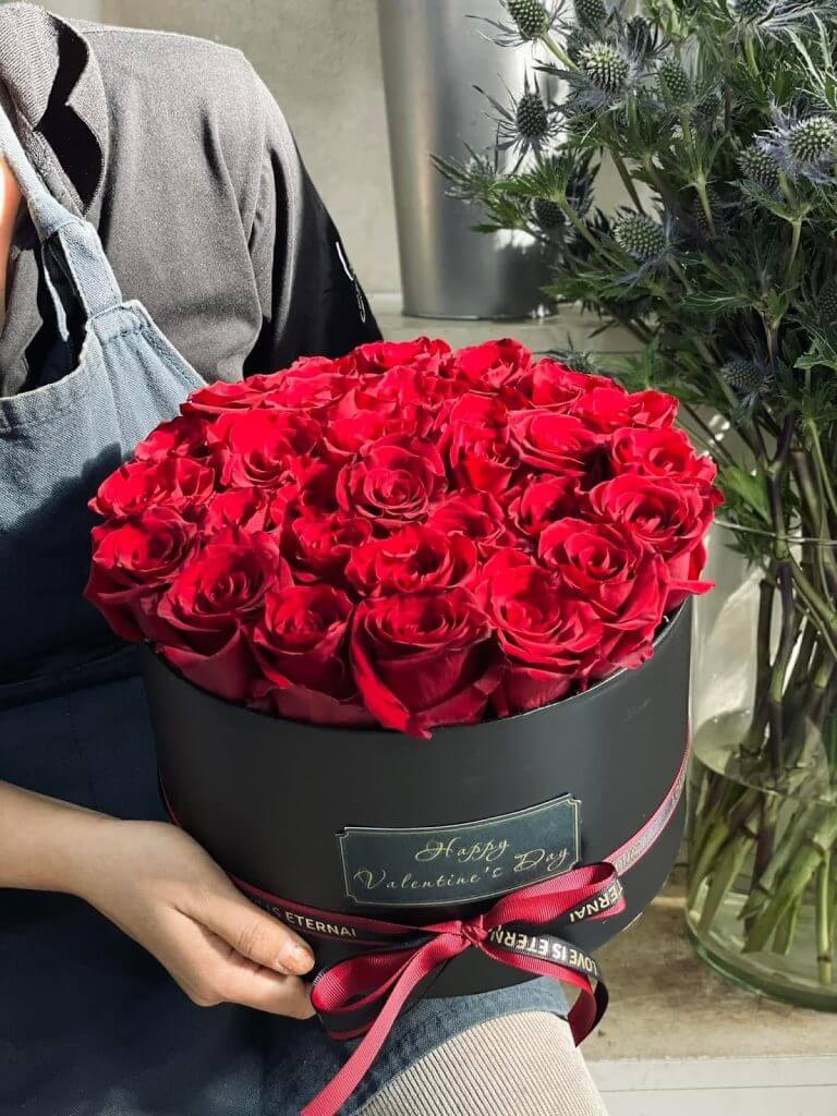 Tại cửa hàng hoa tươi FlowerSight, chúng tôi thường lựa chọn hoa hồng đỏ để bày trí cho sản phẩm hộp hoa hình tròn. Hoa hồng đỏ là loài hơn phổ thông nhất, mang ý nghĩa đặc trưng và thân quen với nhiều người. Hộp hoa đỏ tạo cảm giác phấn khích, yêu đời và thêm phần tự hào về tình yêu này.