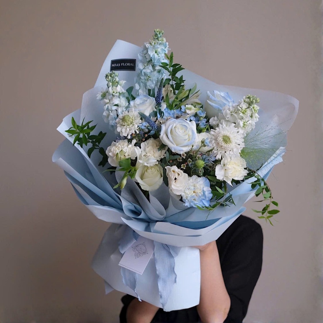 Điểm nhấn là cụm hoa hồng trắng được nhuộm xanh nhạt ở mép cánh. Sắc độ chuyển êm tạo nên cảm giác trong trẻo như sương sớm. Bao quanh là hoa đồng tiền trắng ngà mặt hoa tròn đầy, cùng cẩm chướng trắng kem cánh xếp nhiều tầng, mang lại bề mặt phong phú cho tổng thể. Đan xen giữa các cụm chính là những bông xanh baby như delphinium và veronica xanh nhạt cho hiệu ứng chiều sâu, vài nhụy tròn nhỏ làm điểm sáng ở trung tâm. Lá xanh mảnh dáng rủ như ruscus và một ít dây leo mềm phủi nhẹ viền bó tạo đường viền tự nhiên, cân bằng sự mềm mại và thanh lịch.